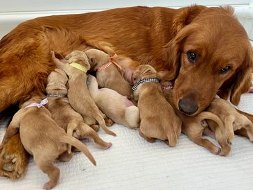 Camrose and Hank had their first litter of puppies 12/27/25!! There are 4 males and 4 females. There is a beautiful golden rainbow in coloring for this litter!! Puppies will be available to go home the weekend of February 21. Please reach out if you are interested in adopting a golden puppy!!